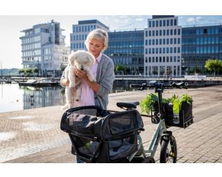 Tern Doghouse Mini je důmyslný systém pro bezpečný a pohodlný převoz malých a středně velkých psů, který snadno nainstalujete kompaktní nebo nákladní elektrokolo Tern. Ve své podstatě se jedná o "měkkou přepravku" pro domácí mazlíčky s nosností až do 13.5 kg. V případě, že otevřete rolovací stříšku, váš pes si bude užívat z jízdy pod širým nebem. V opačném případě na něj nebude pršet nebo svítit přímé slunce. Boční panely ze síťoviny udržují proudění čerstvého vzduchu, aby byl váš pes při jízdě šťastný a zdravý a navíc umožňují přepravovat i štěňata.