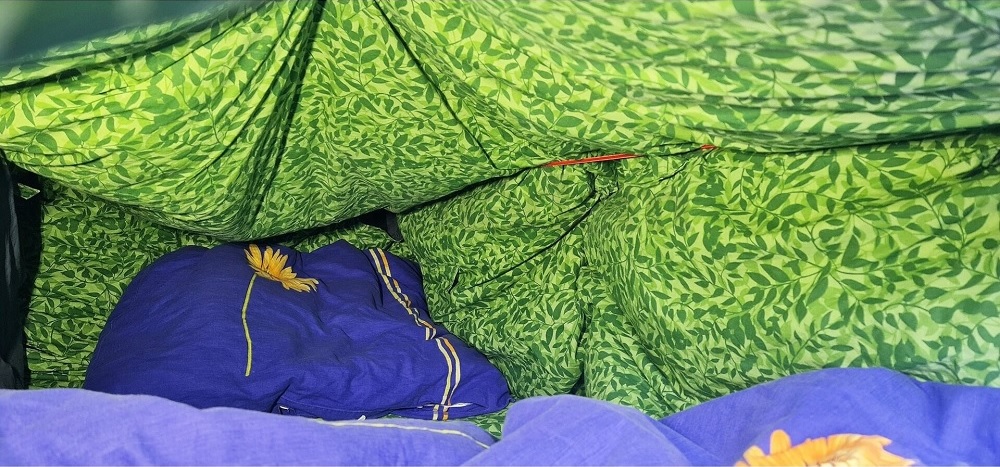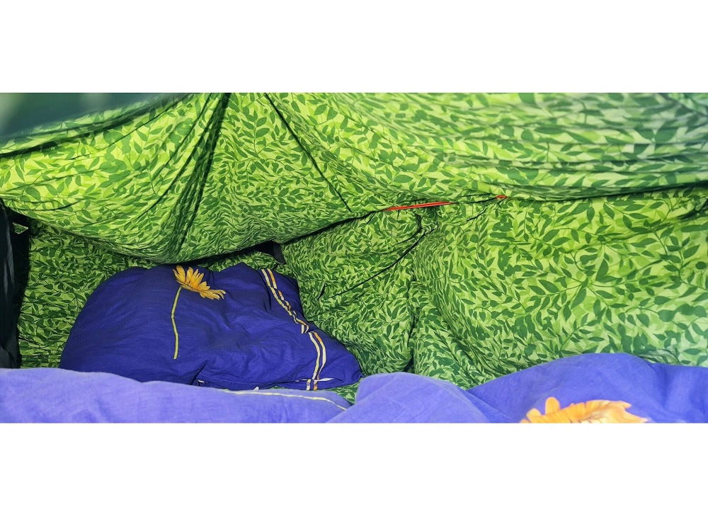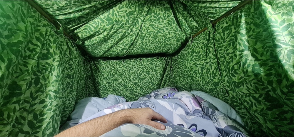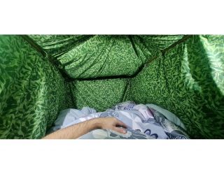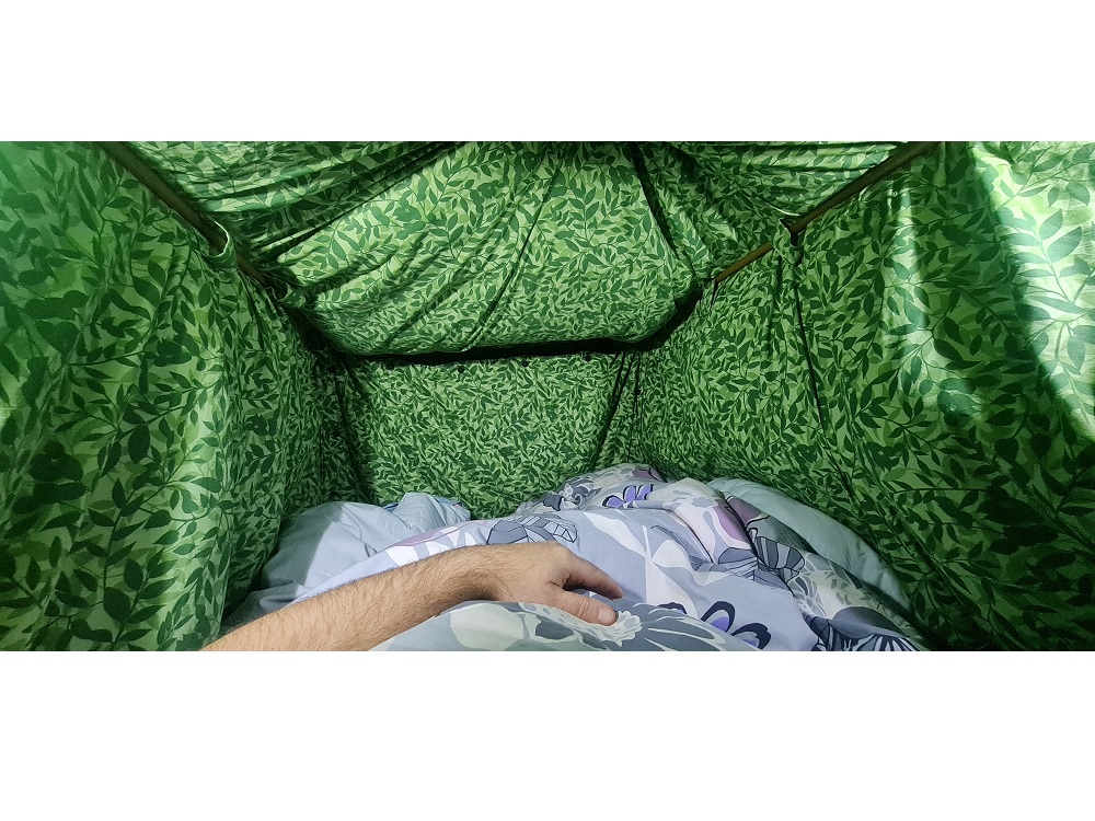 Stan Haaku Malu je velmi dobře prodyšný a udržuje teplo, které vaše tělo vyzařuje a které vydýcháte. Ideálně je určený pro dvě osoby, kdy je tepelný komfort skutečně velmi vysoký a rozdíl mezi vnější a vnitřní teplotou může být i více než 23° (samozřejmě záleží na velikosti a váze osob a i dalších parametrech). Teplotu lze velmi snadno regulovat rozepnutím knoflíků na krátkých stranách a tím měnit teplotu uvnitř stanu. Vzor provedení vnitřní části stanu jsou zelené lístečky, vnější plášť je tmavě šedý. Zelená barva je příjemná a uklidňující, zatímco šedý plášť působí diskrétně při pohledu z venku a navíc omezuje pronikání světla a to také podpoří kvalitní odpočinek.