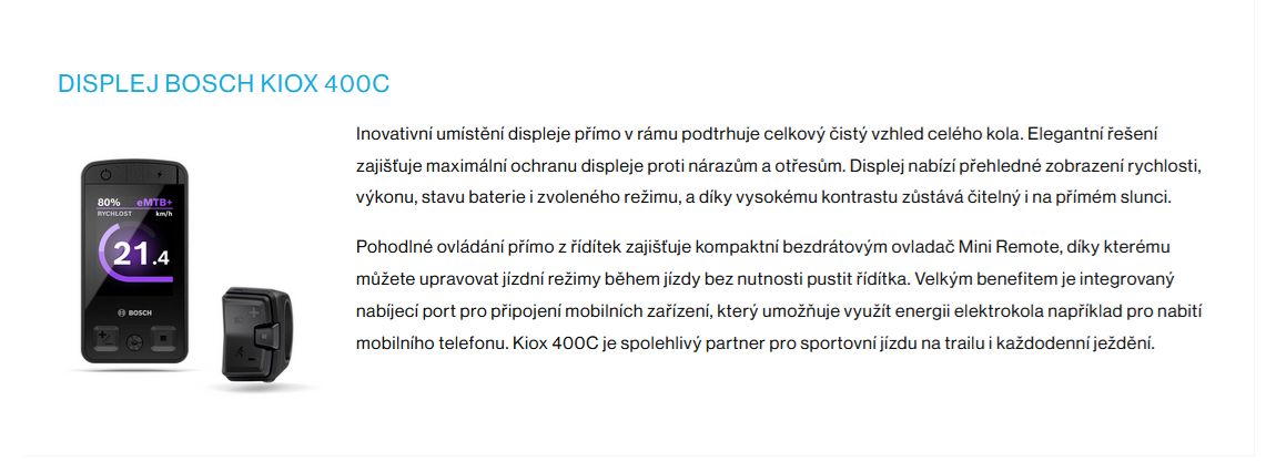 | Ovládací jednotka | Bosch Kiox 400C v kombinaci s Bosch Mini Remote Smart (možnost mobilní aplikace Bosch eBike Flow APP) |